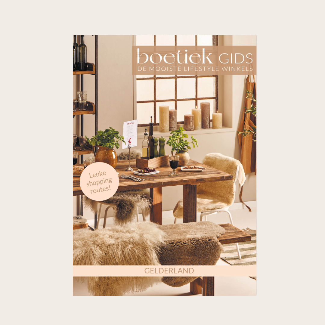 Een gids met unieke lifestyle boetieks; kleinschalige winkels gerund door zelfstandigen, waar je terecht kunt voor een fijne mix van o.a. mooie woonaccessoires, meubels, kleding, cadeaus, tassen, verf en bloemen. In de Boetiek Gids nemen we ook sfeervol ingerichte overnachtingsadressen en koffie/theeschenkerijen op om jouw shoppinguitje compleet te maken!