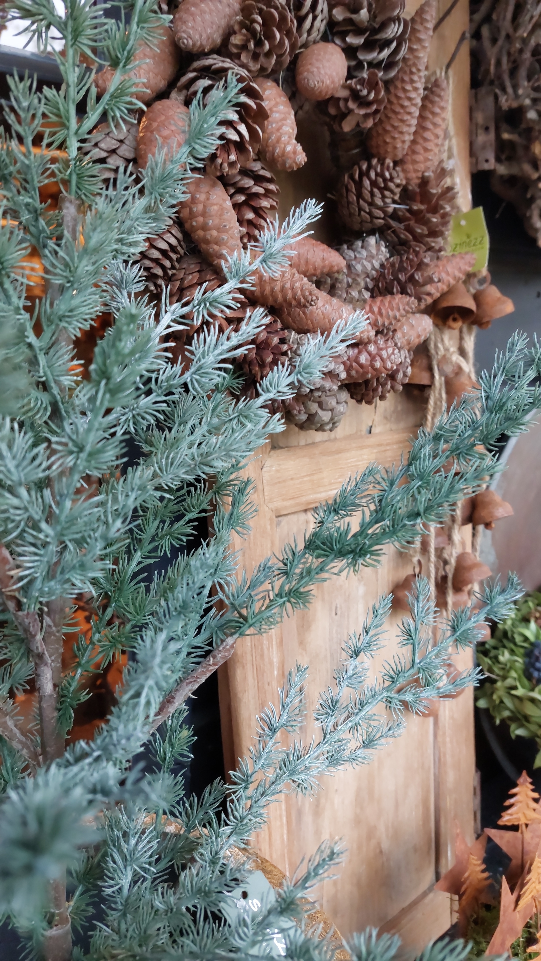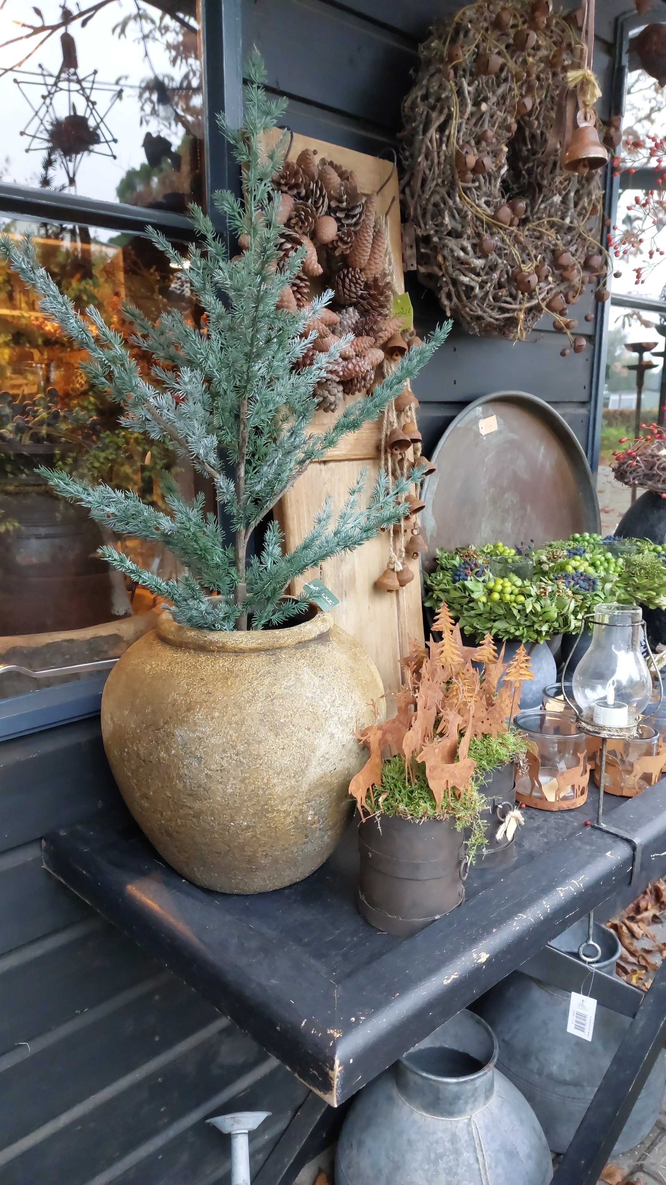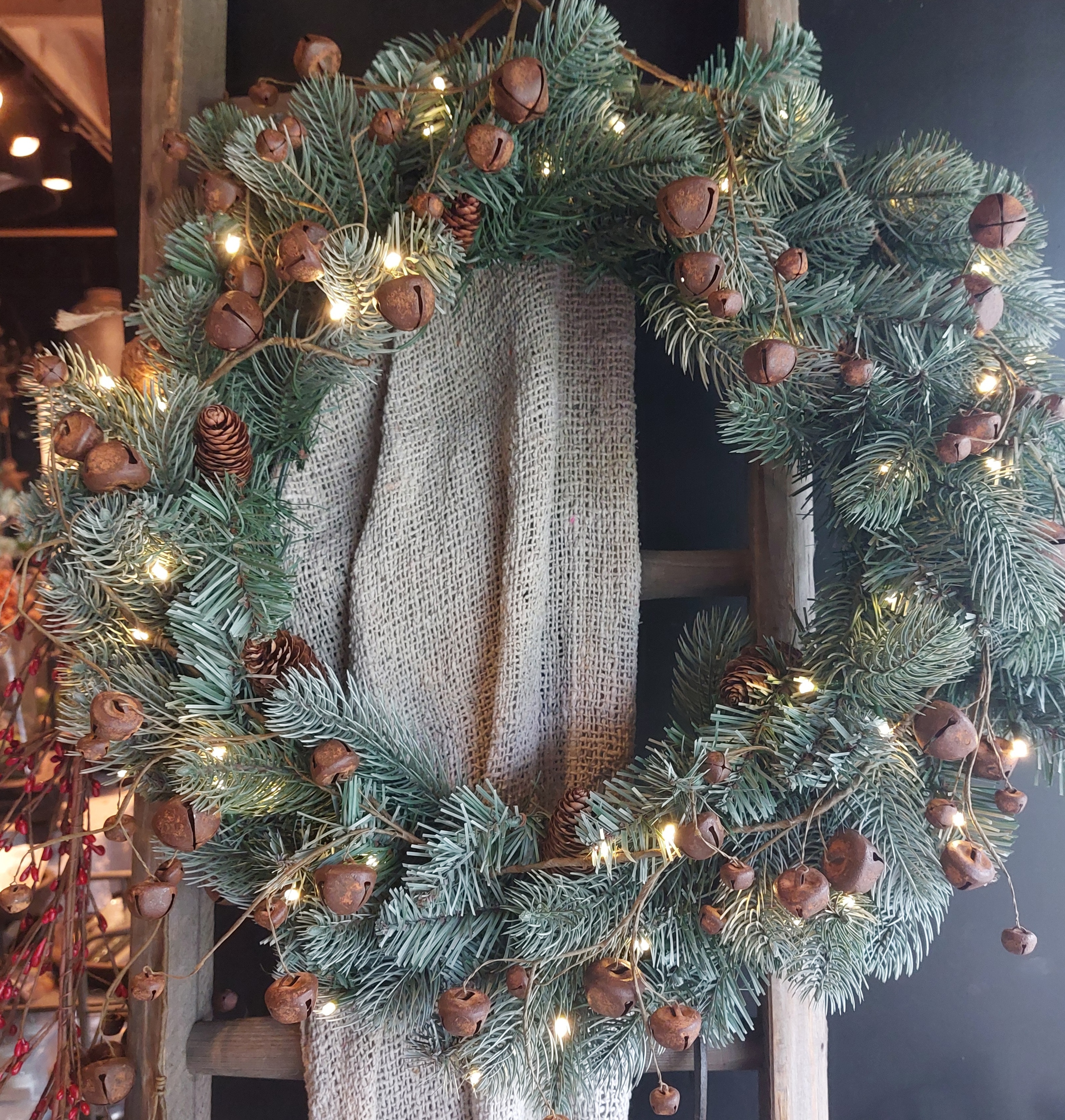 Deze guirlande van roestige belletjes is erg leuk om mee te decoreren. Hier is hij verwerkt in een robuuste krans.