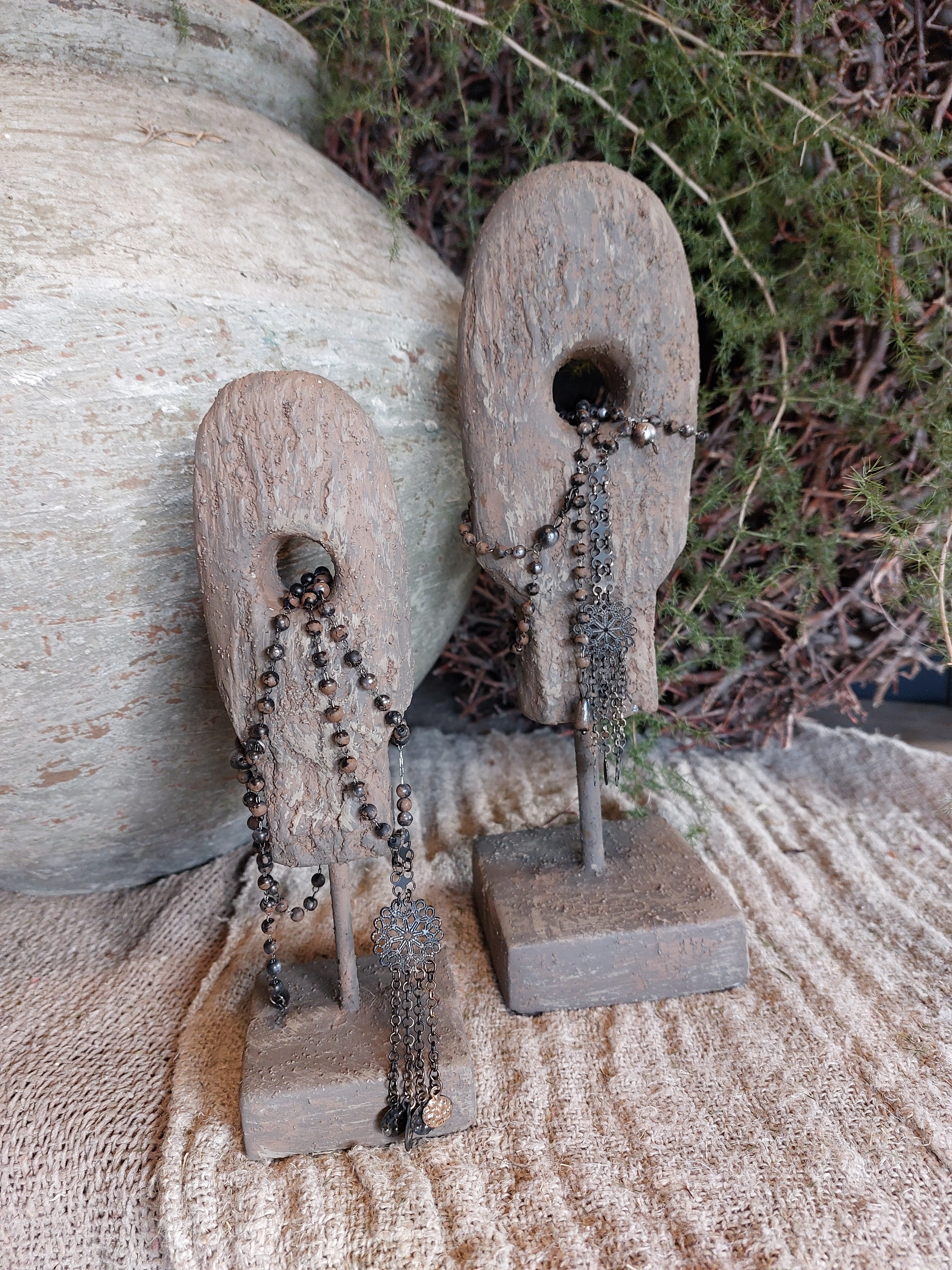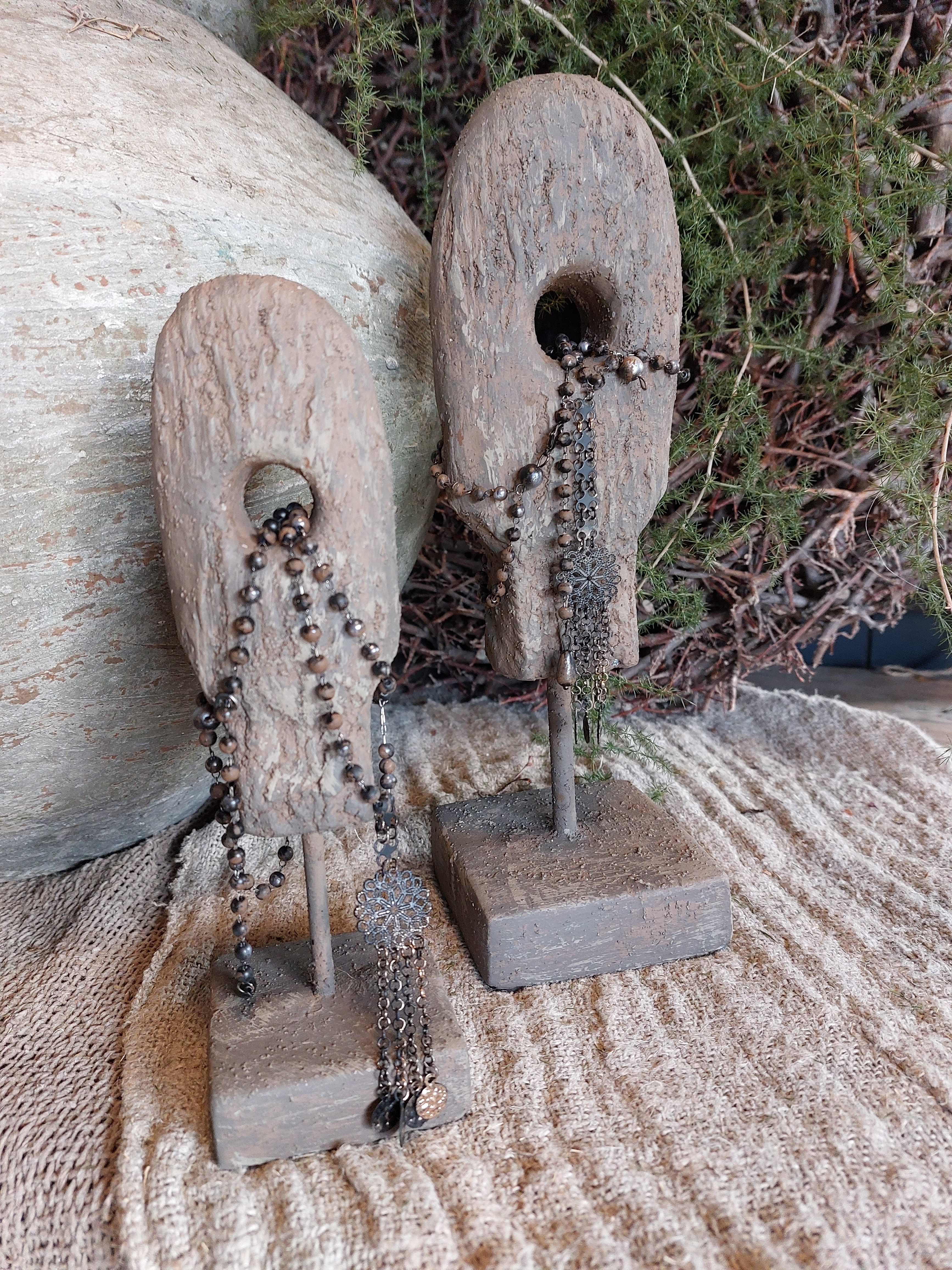 Robuust en uniek is dit ornament, gedecoreerd met een kettinkje. In een warme grijs/beige kleur.