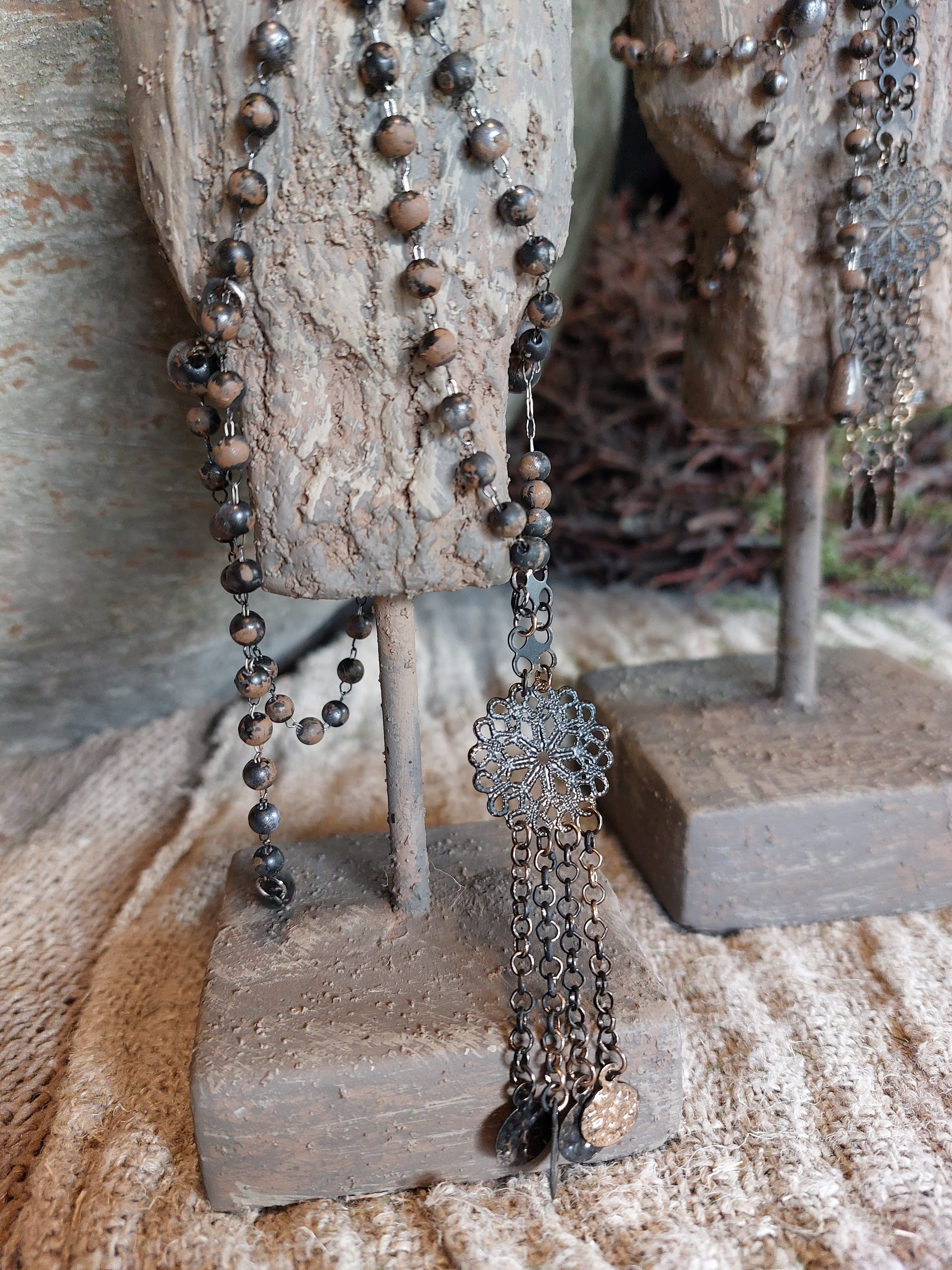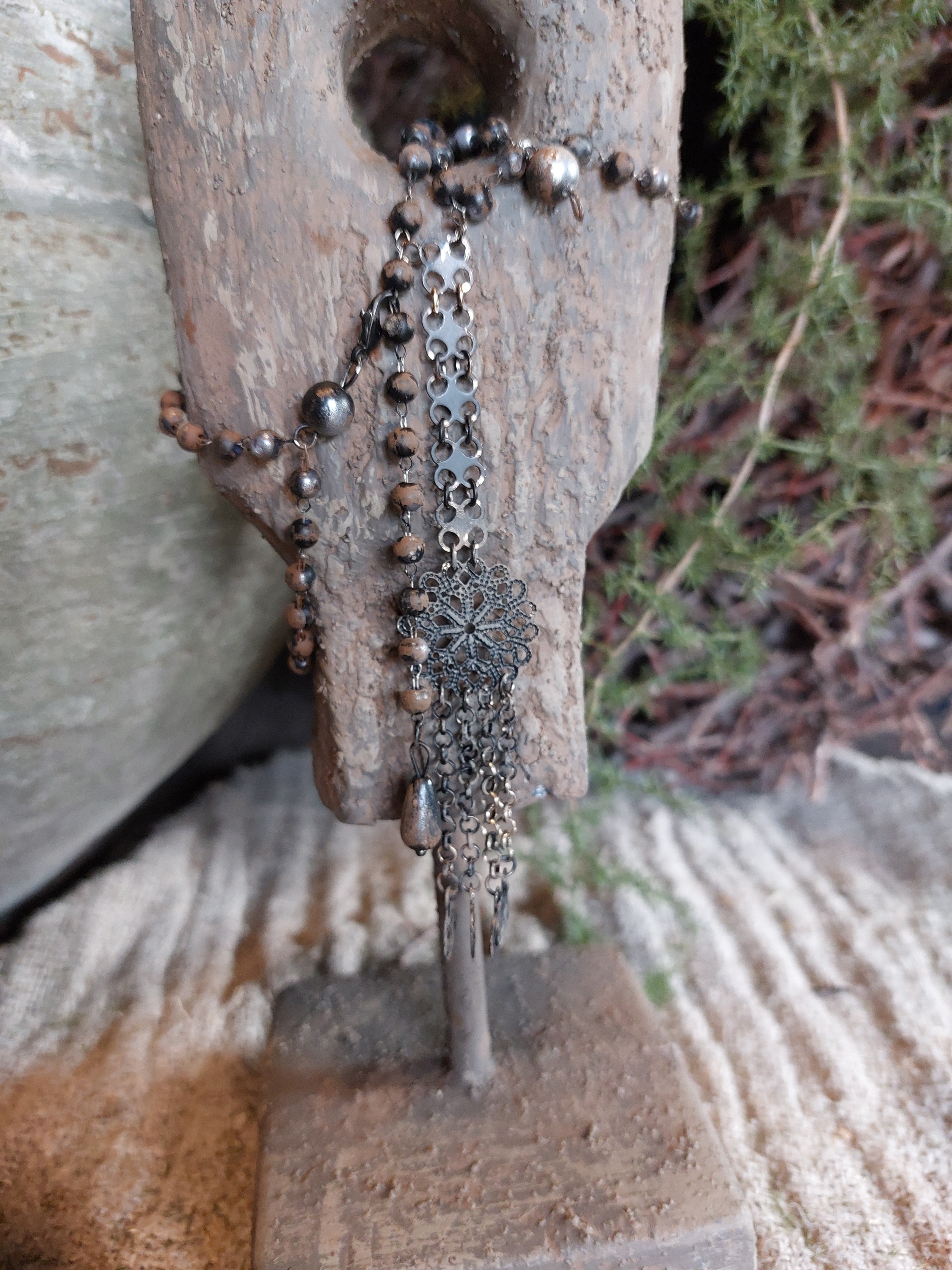 Metalen ornament hanger aan subtiel ijzeren ketting, prachtig bewerkt. De hoogte is 6,5 cm, de diameter is 6 cm.
