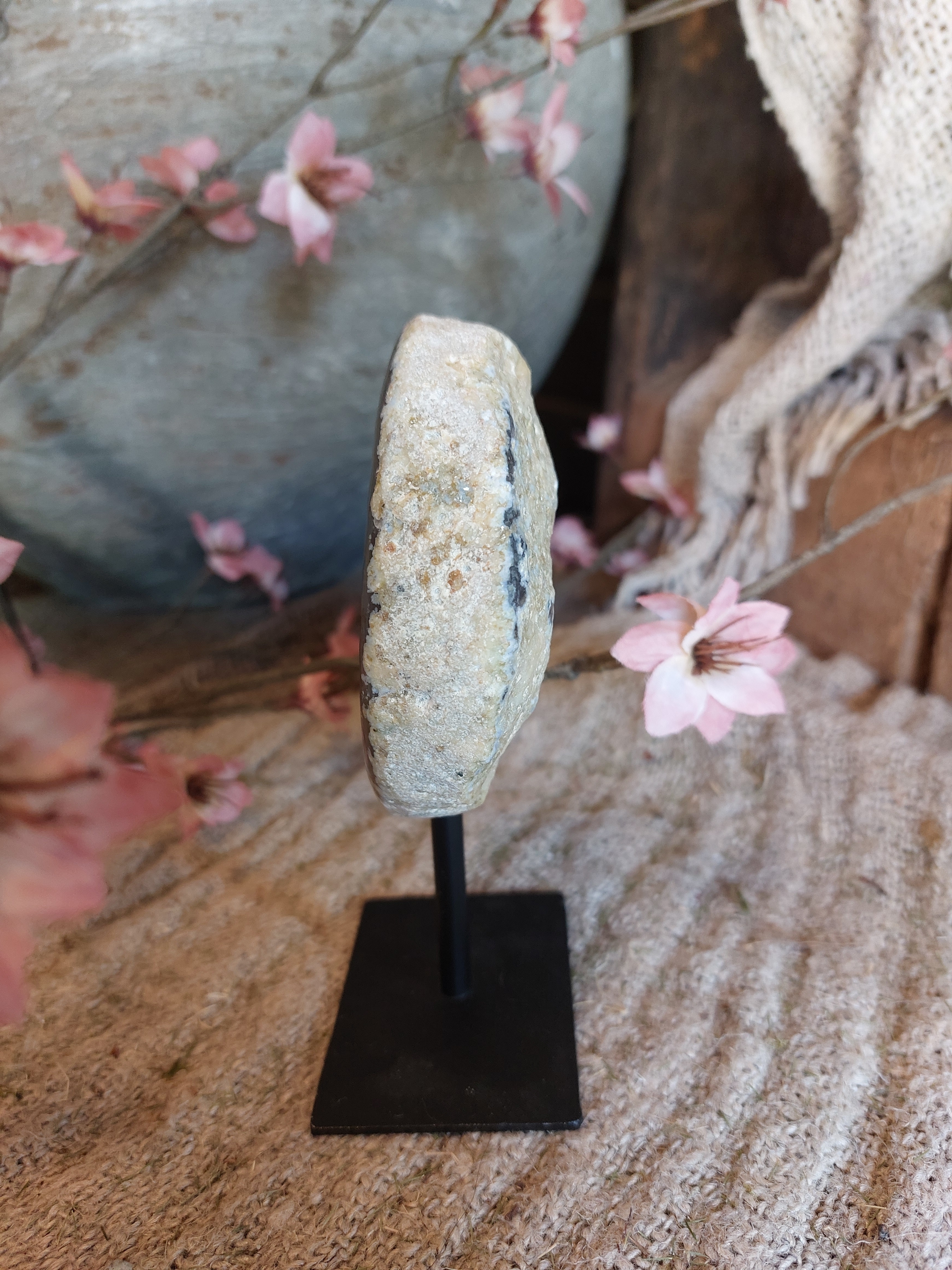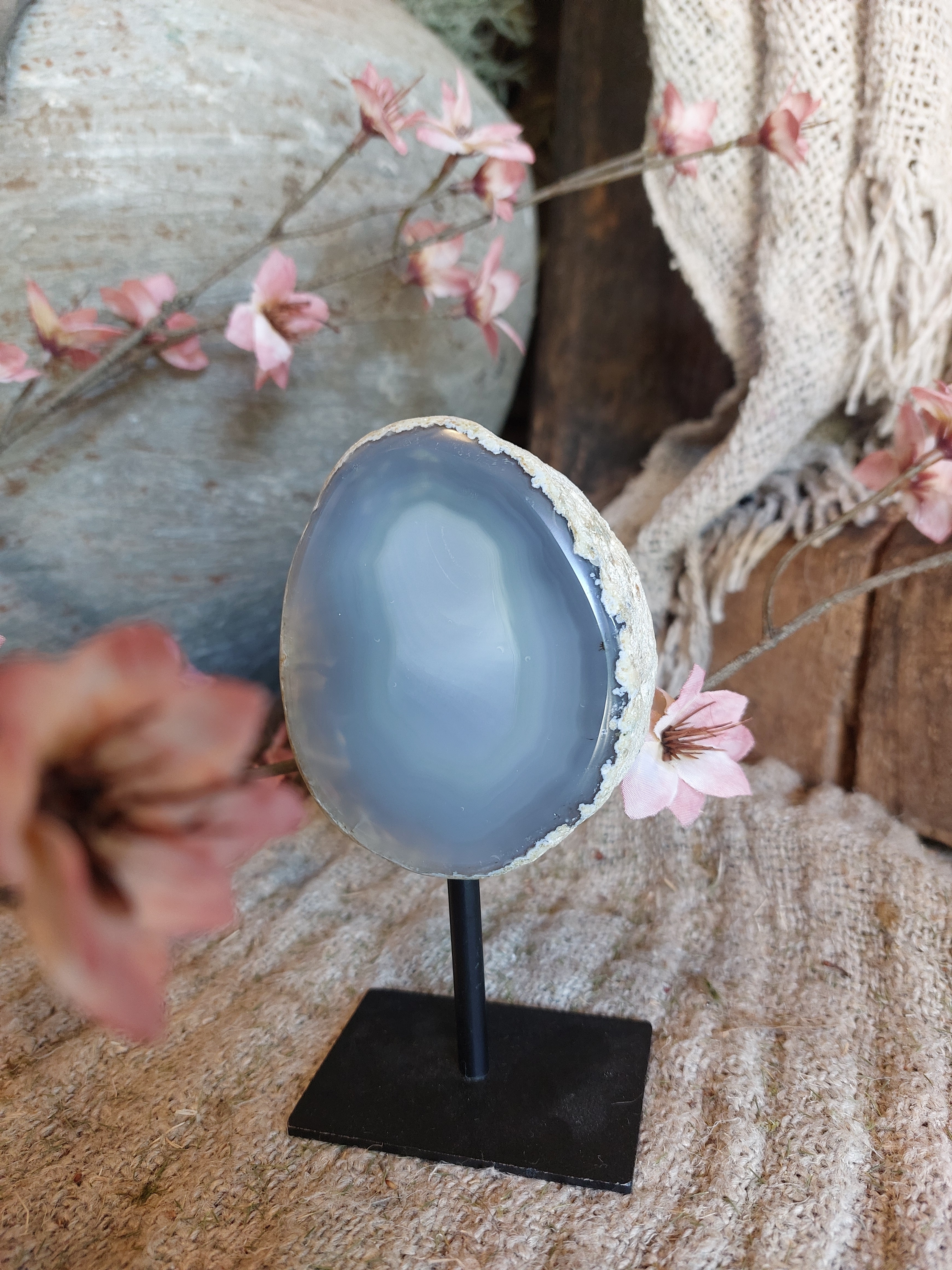 Deze agaat op standaard is een echte blikvanger in je interieur. Het natuurlijke gesteente heeft een unieke tekening en subtiele kleurnuances, waardoor elk stuk een eigen karakter heeft.De combinatie van ruwe agaath en een stevige voet zorgt voor een stoer en tegelijk verfijnd geheel.