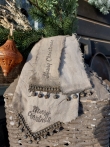 Prachtig sober kalkdoek in de kleur zand. In een hoek staat de tekst Merry Christmas en is daar afgewerkt met belletjes. Afm.: 45x45cm. Het doek is rafelig afgewerkt. San7interieur.