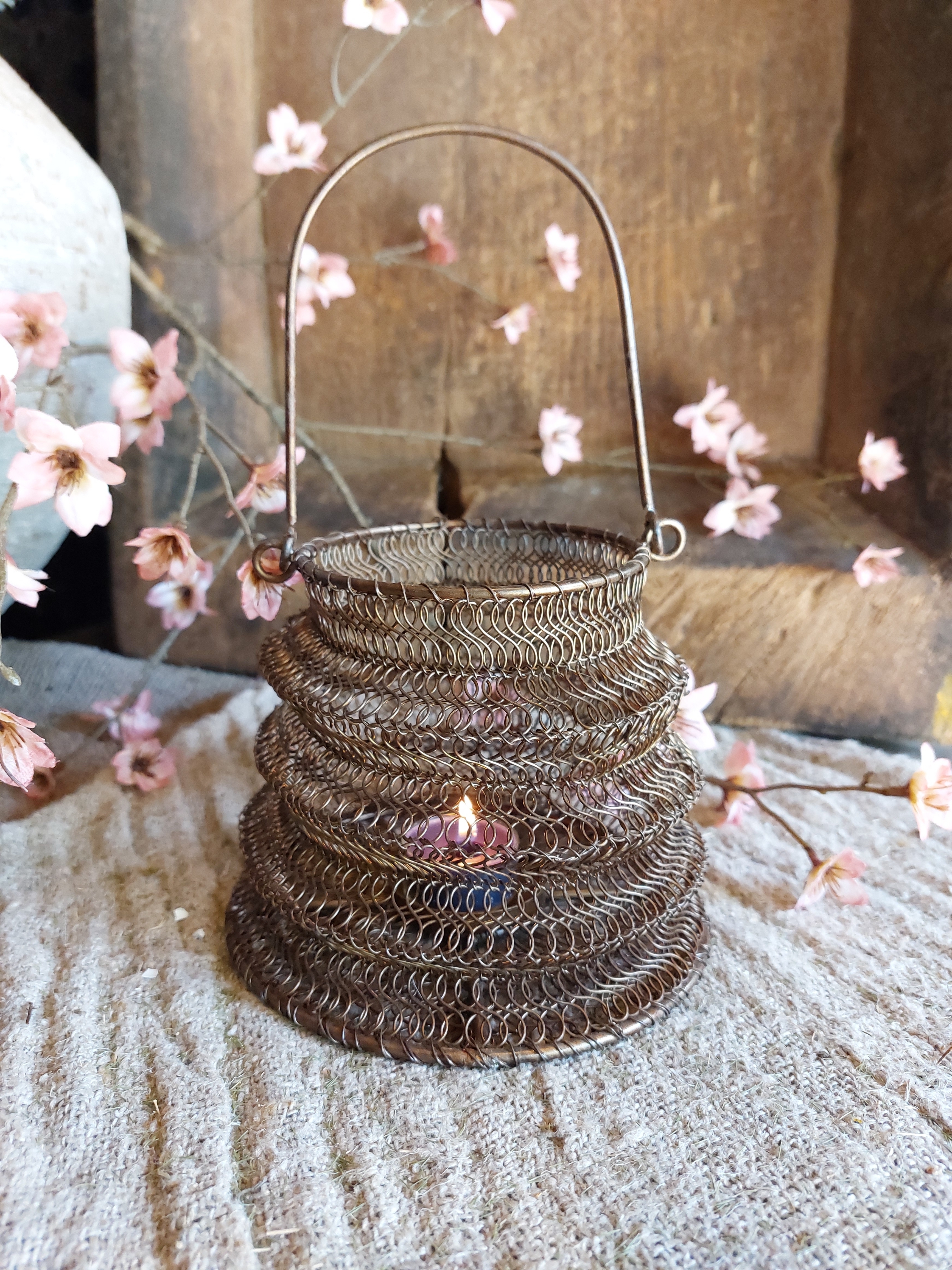 Deze metalen vouwlantaarn in old gold heeft een warme, doorleefde uitstraling.