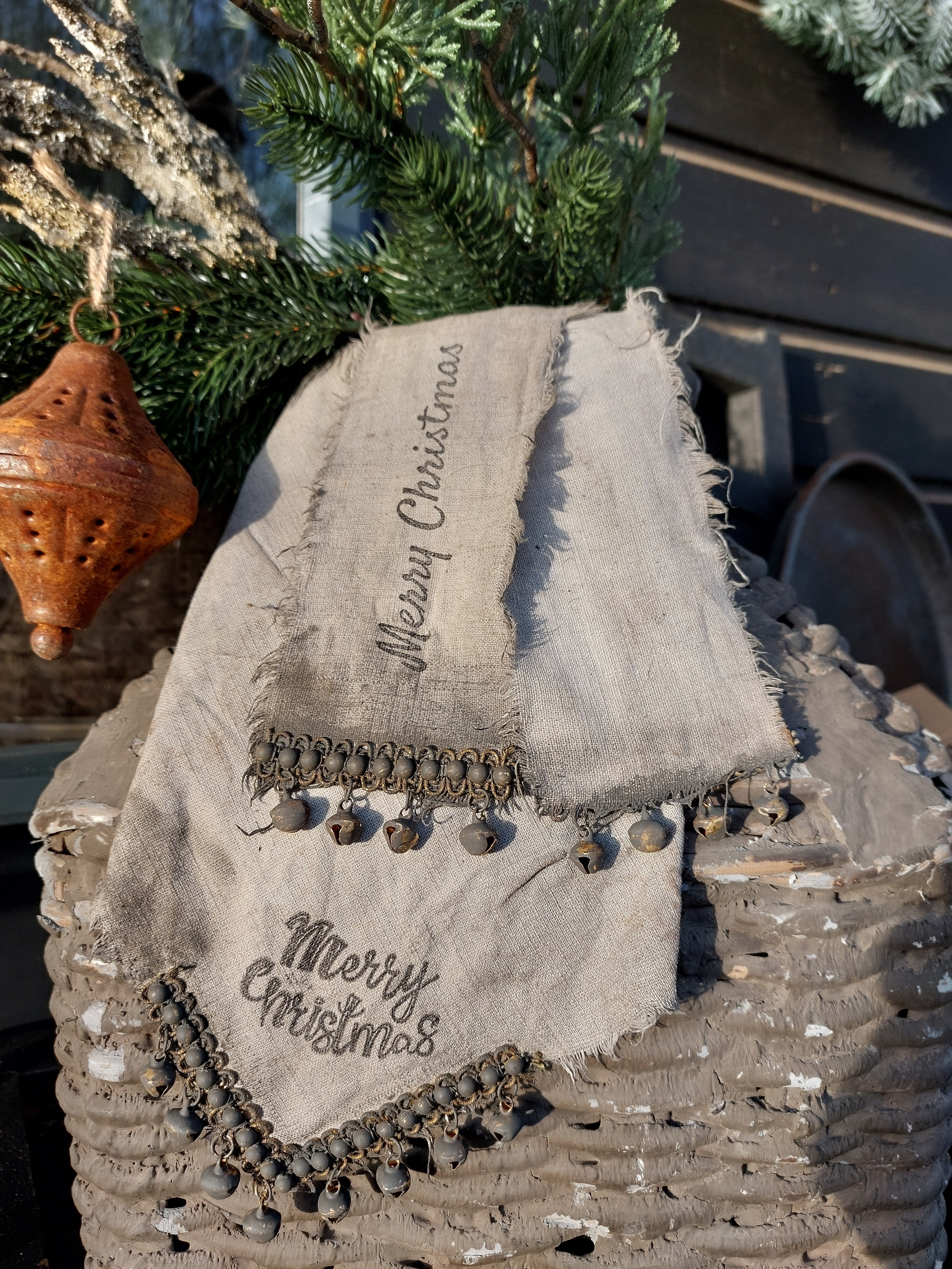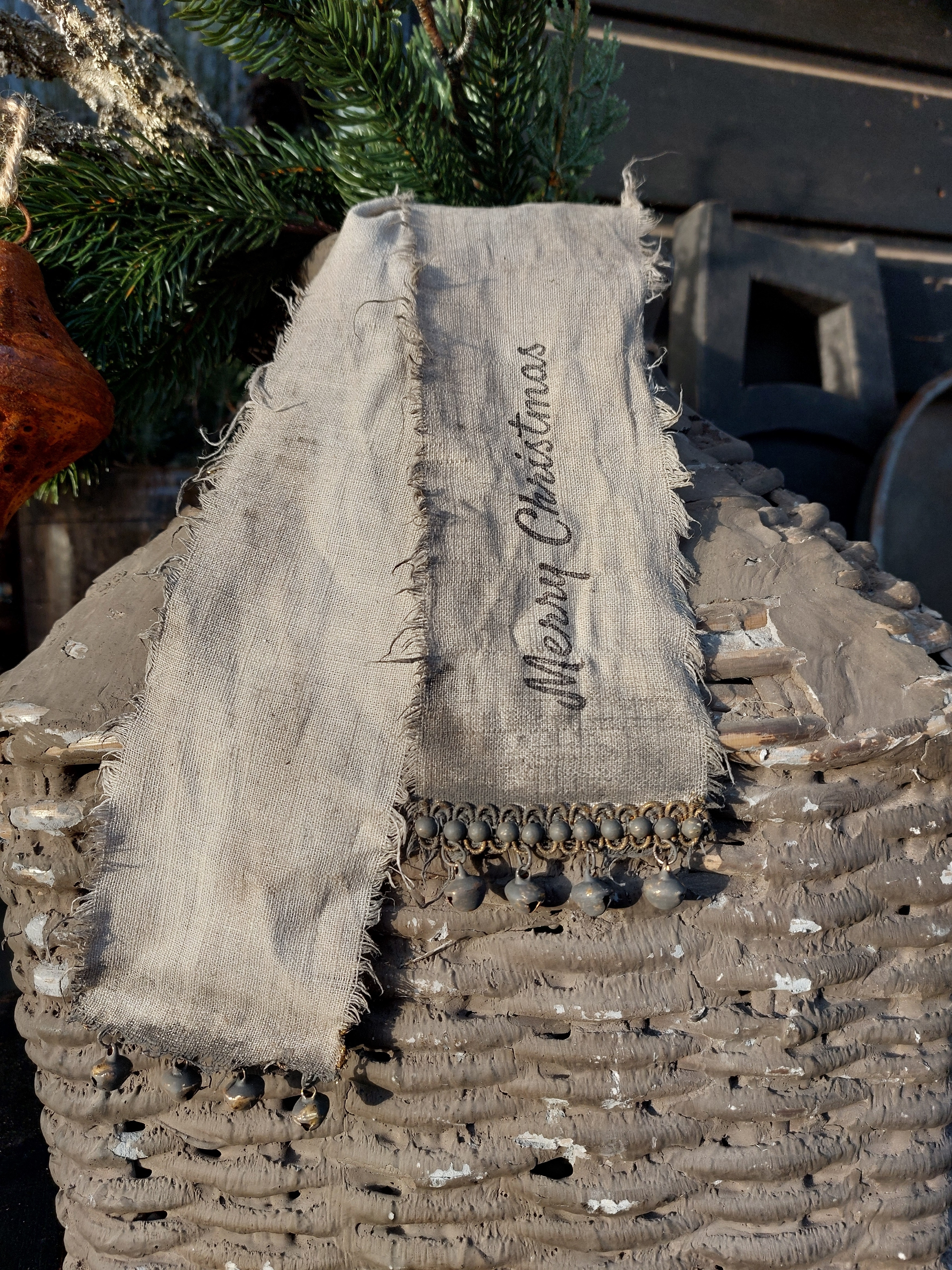 Prachtig sober lint van kalkdoek. Aan de uiteinden zitten belletjes verwerkt. Aan 1 kant staat de tekst Merry Christmas.