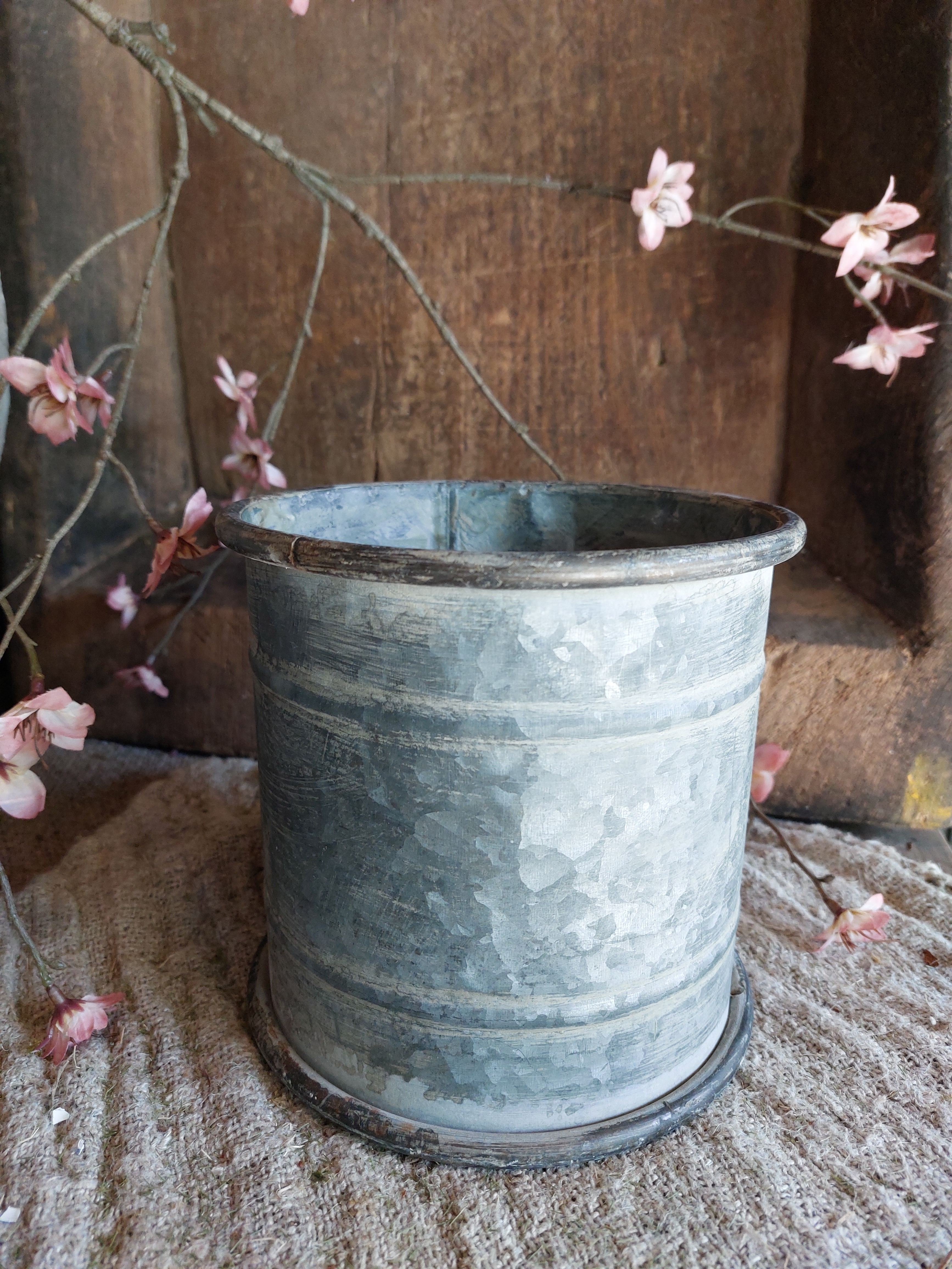 Deze rechte zinken pot heeft een eenvoudige, robuuste uitstraling.