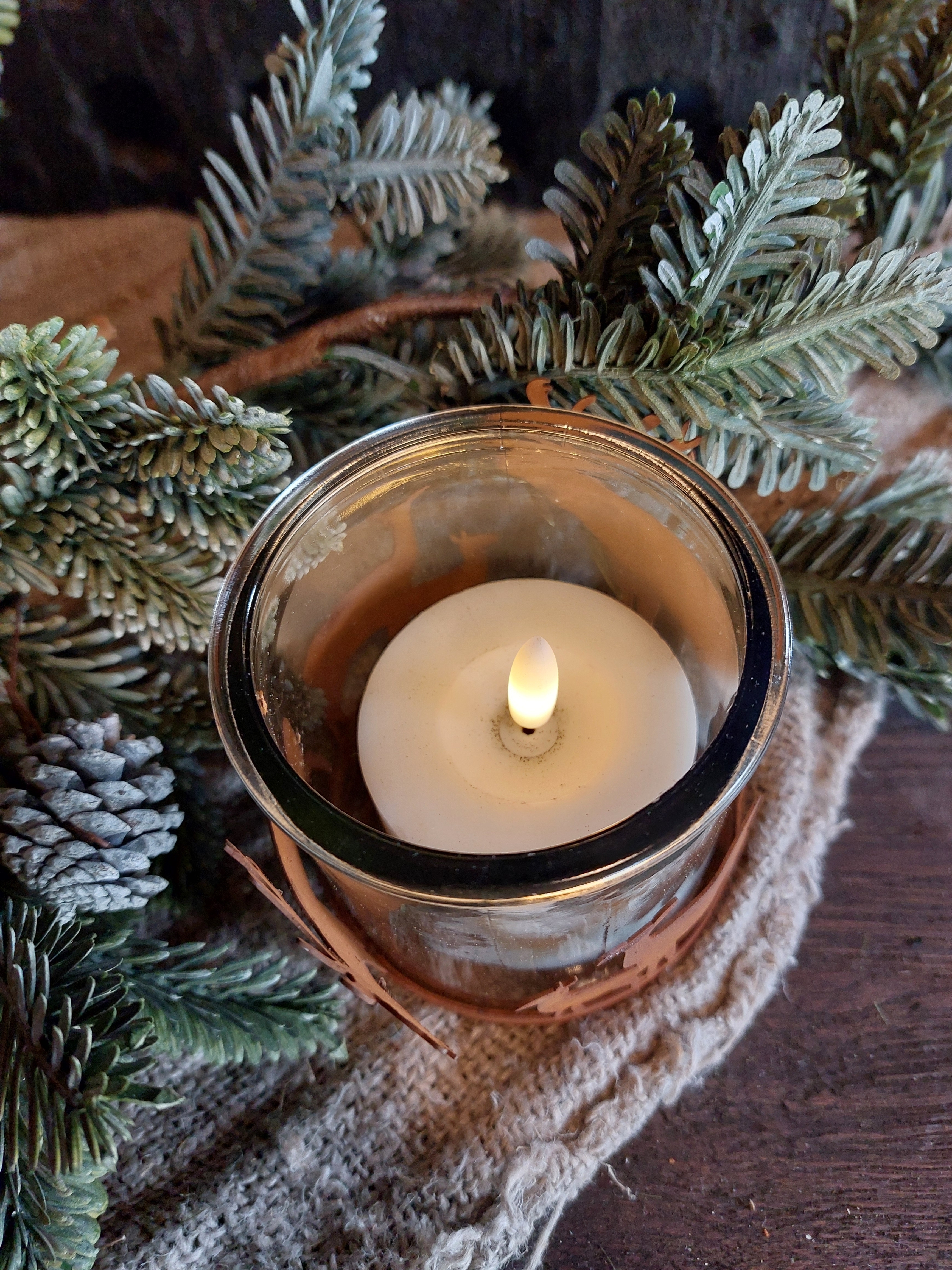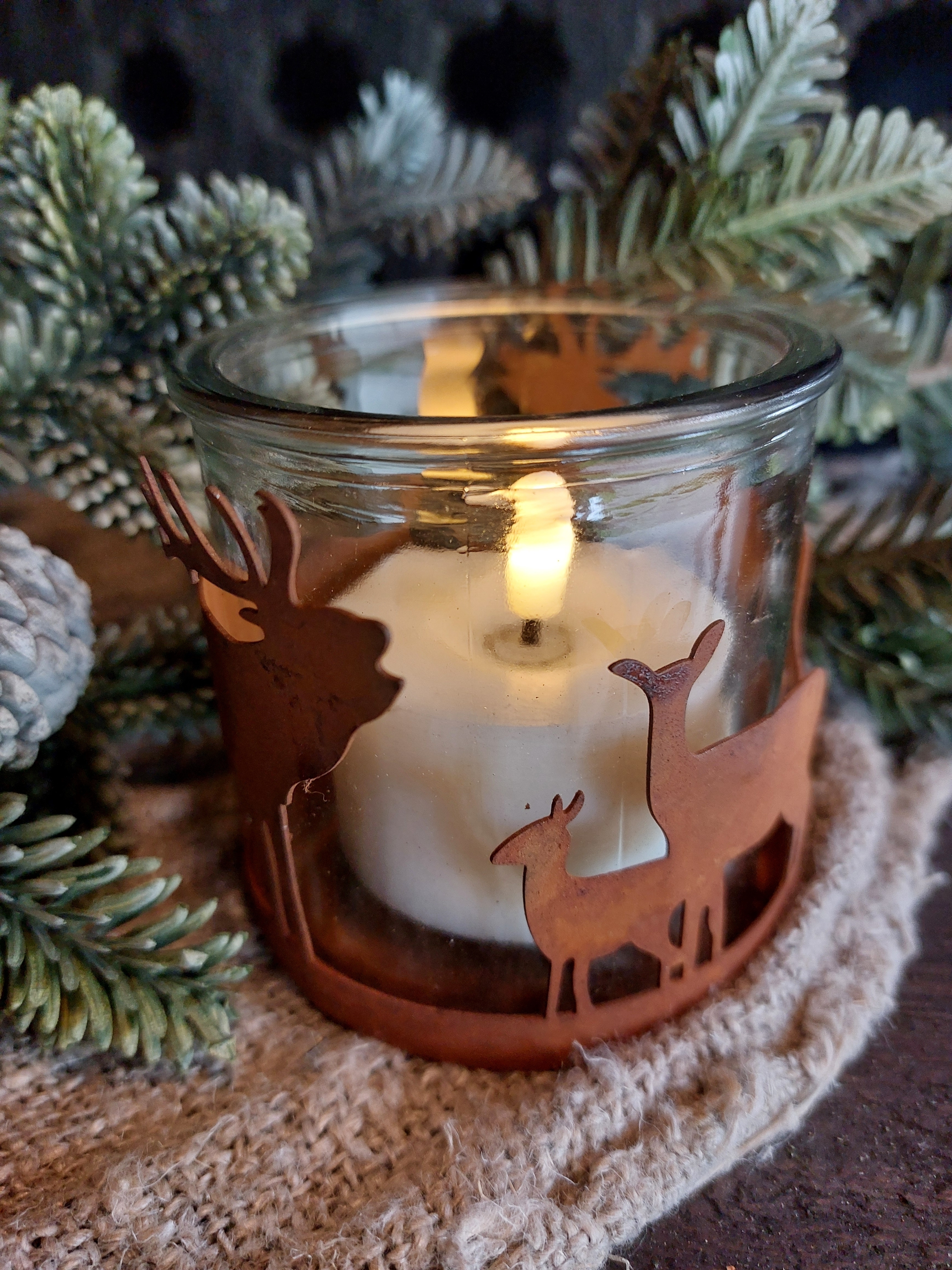 Glazen windlicht, in een roestige houder met hertjes eromheen.
