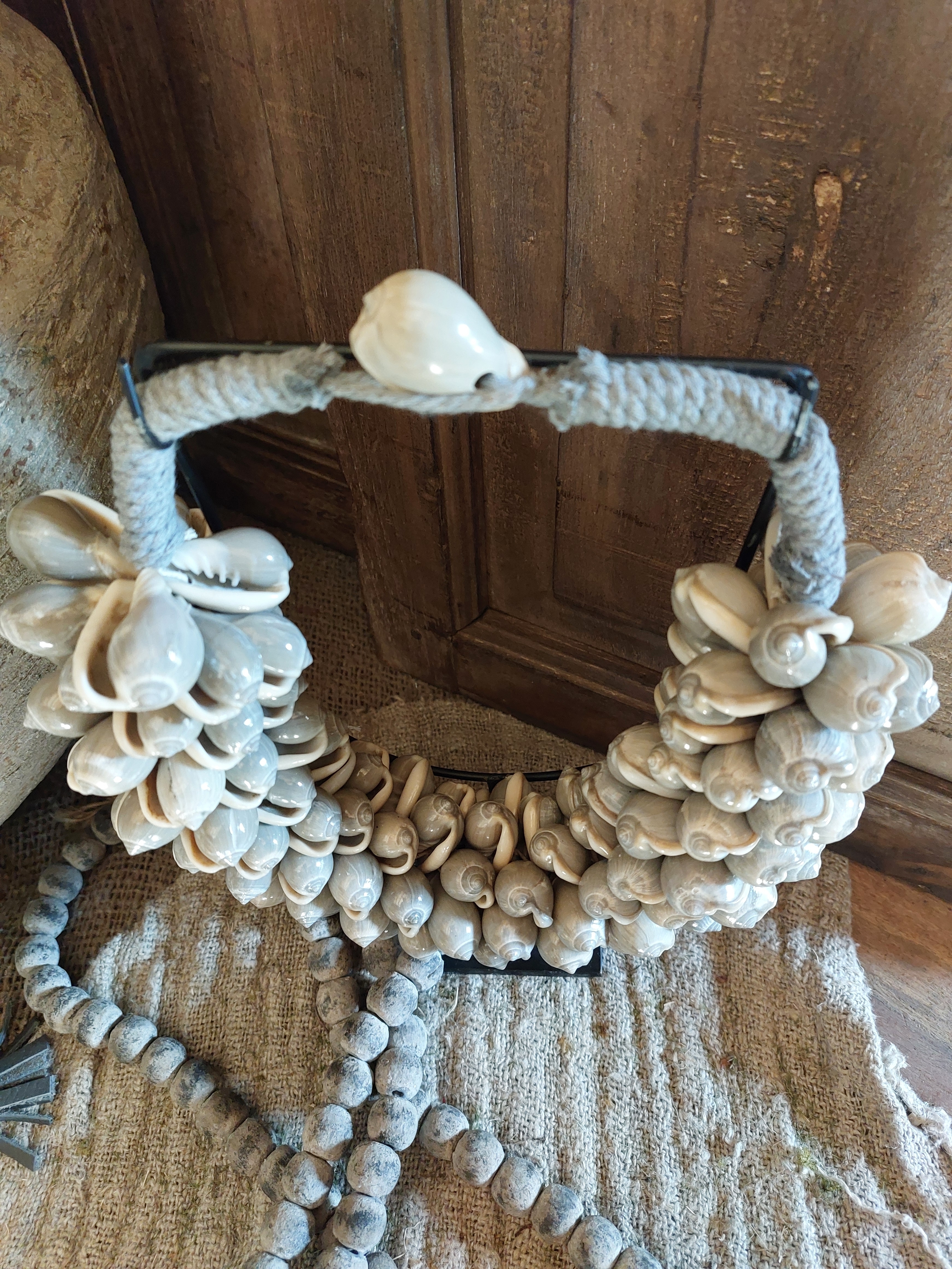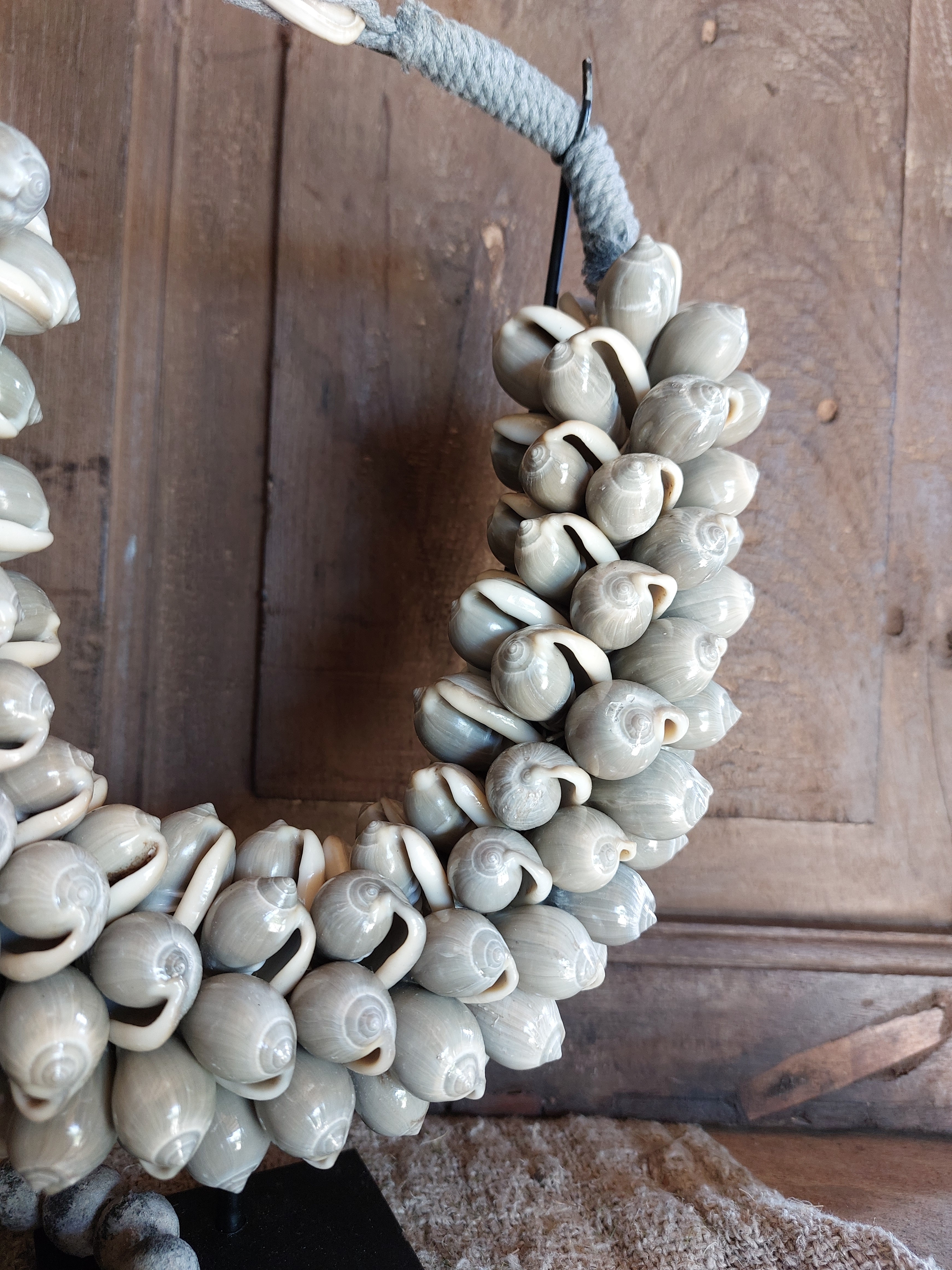 Sfeervolle schelpenketting op standaard, met een natuurlijke, sobere uitstraling.