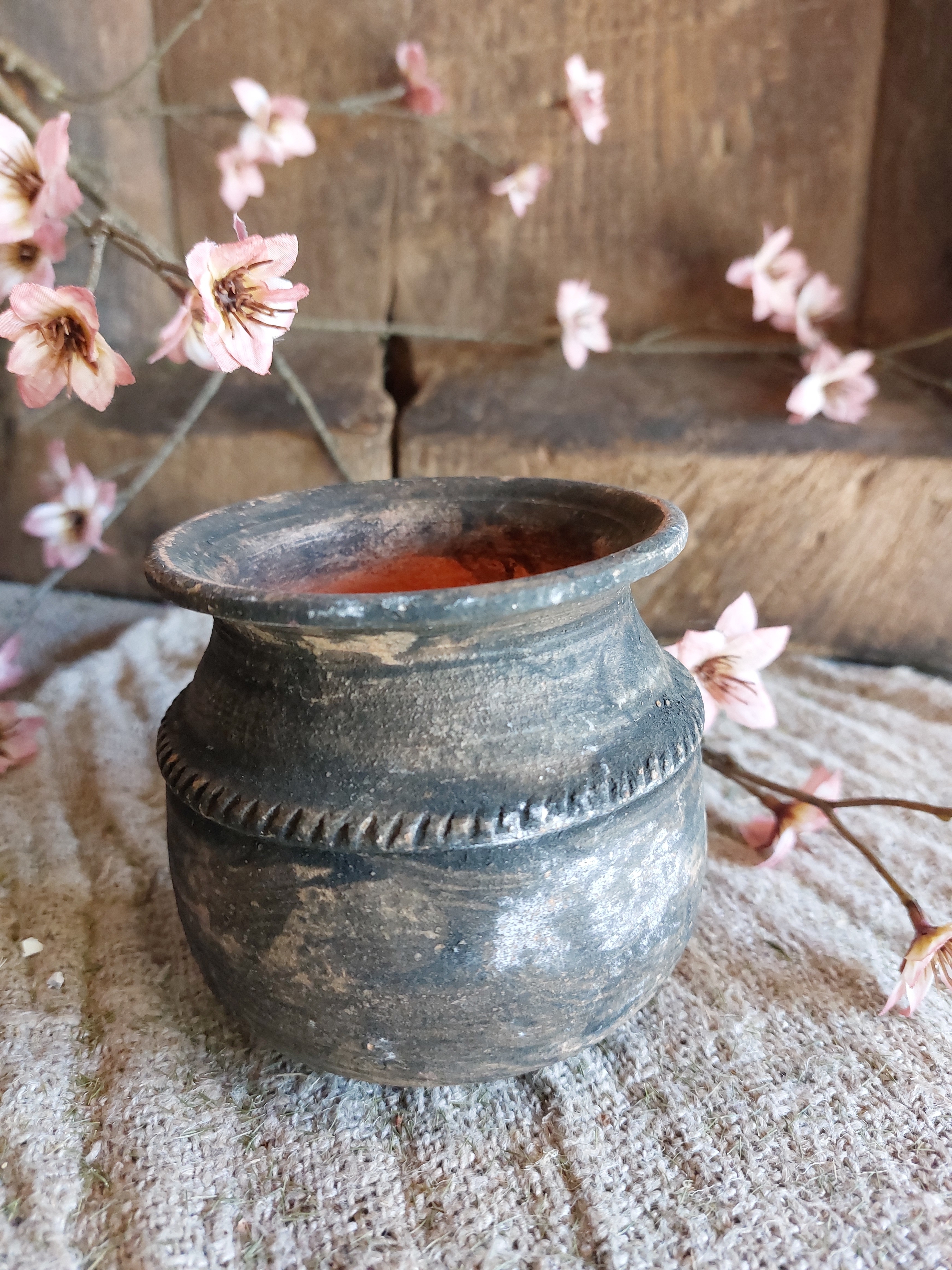 Dit kleine tuimelkruikje straalt rust en eenvoud uit. De zachte, ronde vorm en het subtiele tuimeleffect geven het kruikje een uniek maar ingetogen karakter, passend binnen een landelijke en sobere woonstijl.